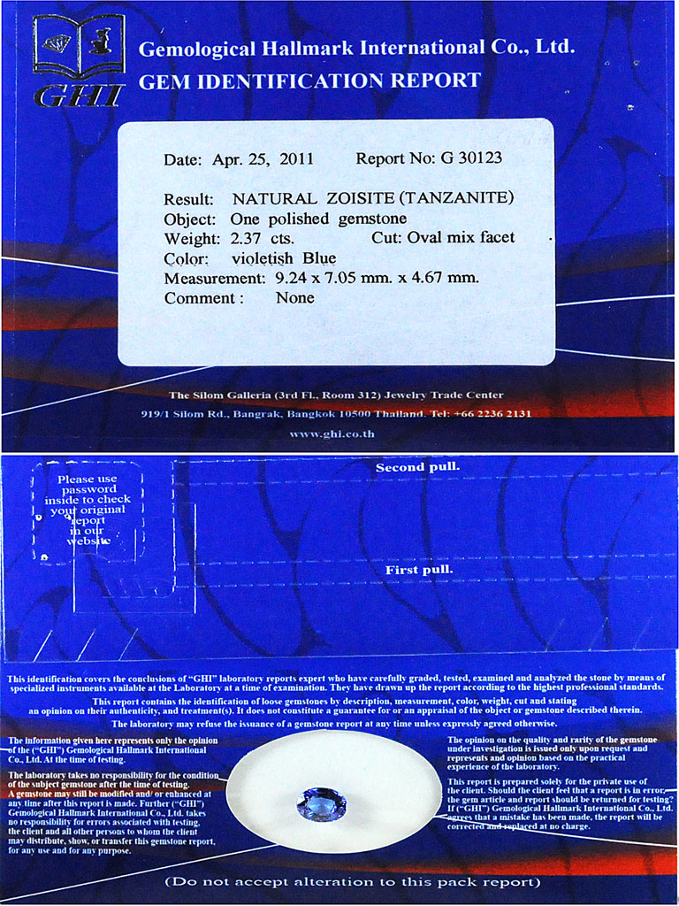 Certified Violetish Blue Tanzanite 2.37 Ct. Clean Oval 9.24 x 7.05 Mm. Natural