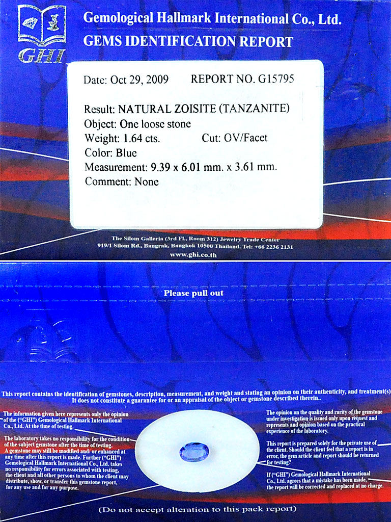 Certified Blue Tanzanite 1.62 Ct. VVS Oval 9.39 x 6.01 Mm. Natural Gemstone