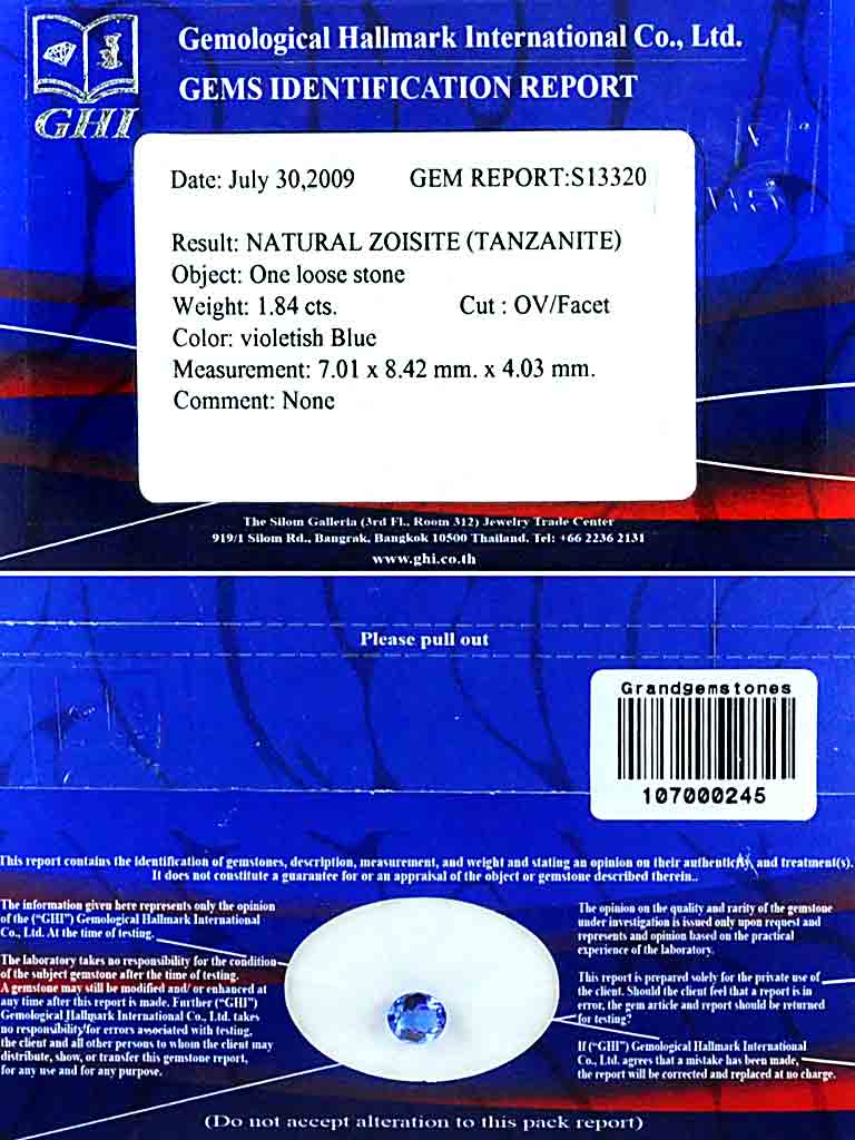 Certified Violetish Blue 1.84 Ct. VVS Oval 8.42 x 7.01 Mm. Natural Gem Tanzanite