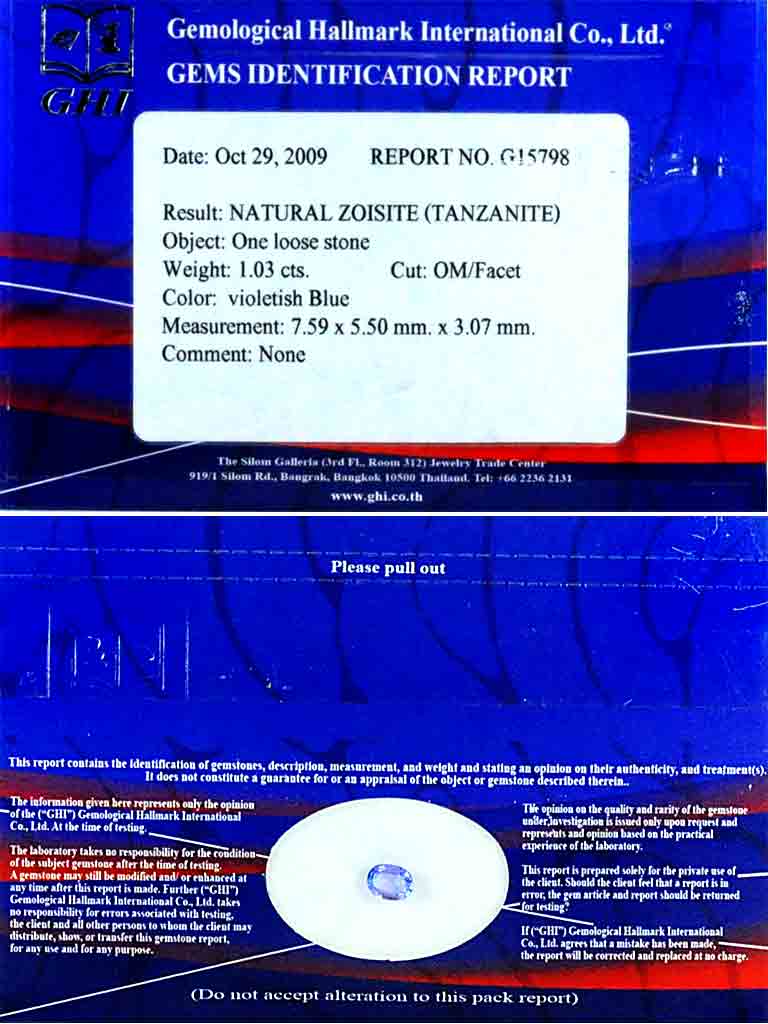 Certified Violetish Blue Tanzanite 1.03 Ct. VVS Oval 7.59 x 5.50 Mm. Natural Gem