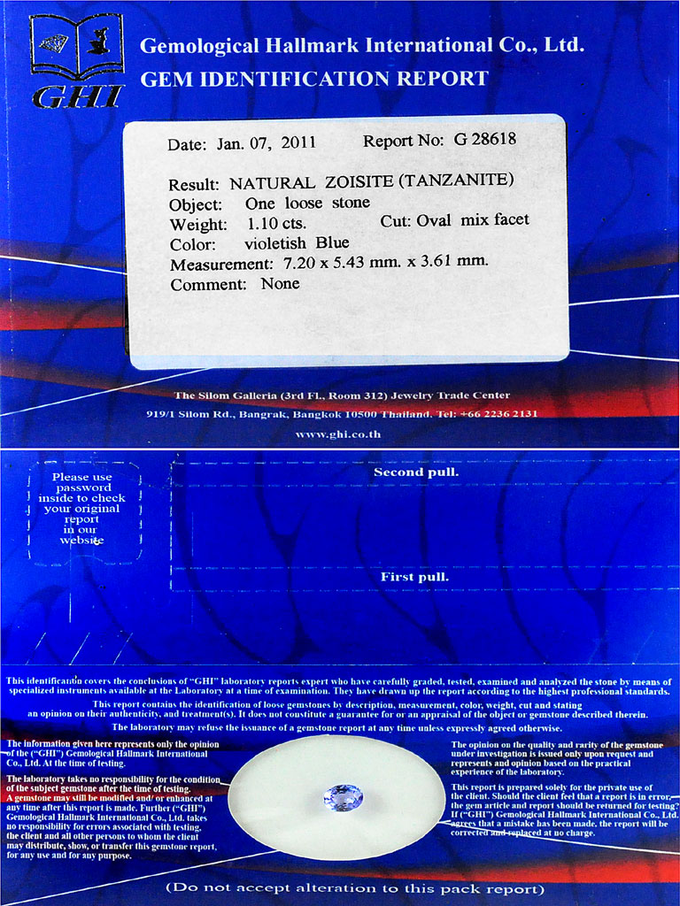 Certified Violetish Blue Tanzanite 1.10 Ct. VVS Oval 7.20 x 5.43 Mm. Natural Gem