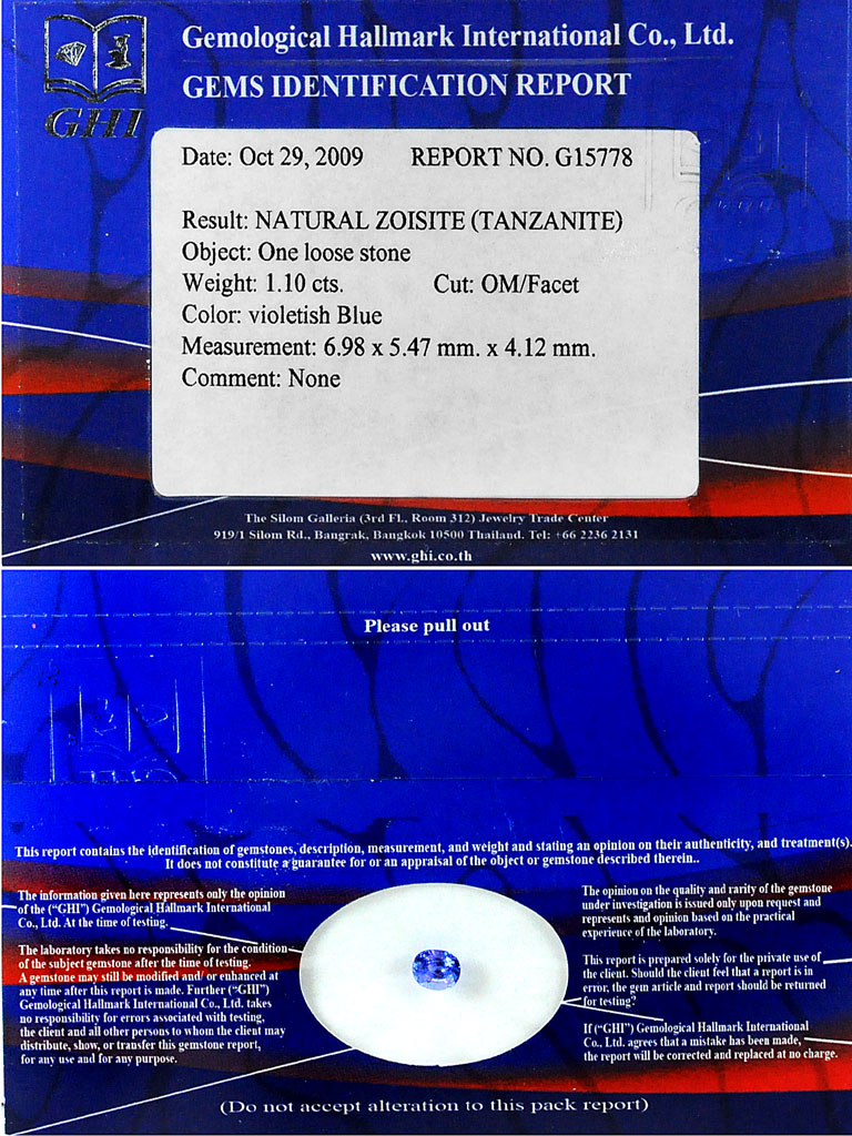 Certified Violetish Blue Tanzanite 1.10 Ct. VVS Oval 6.98 x 5.47 Mm. Natural Gem
