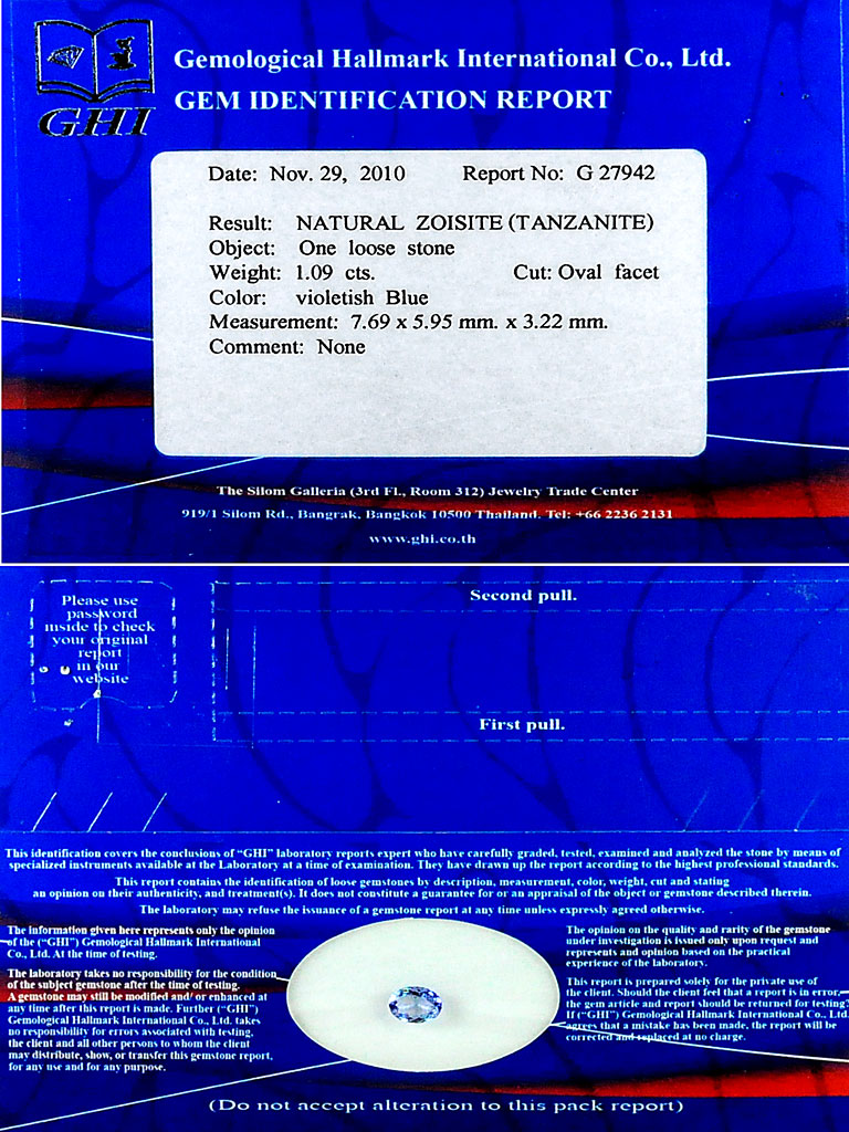 Certified 1.09 Ct. IF Natural Violetish Blue Tanzanite