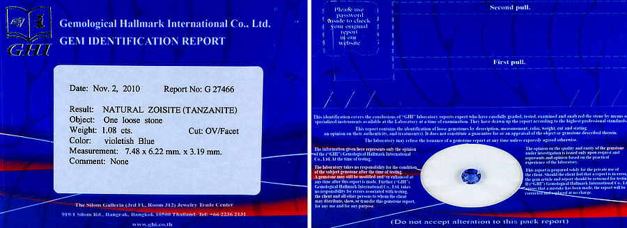 Certified Violetish Blue Tanzanite 1.08 Ct. VVS Oval 7.48 x 6.22 Mm. Natural Gem