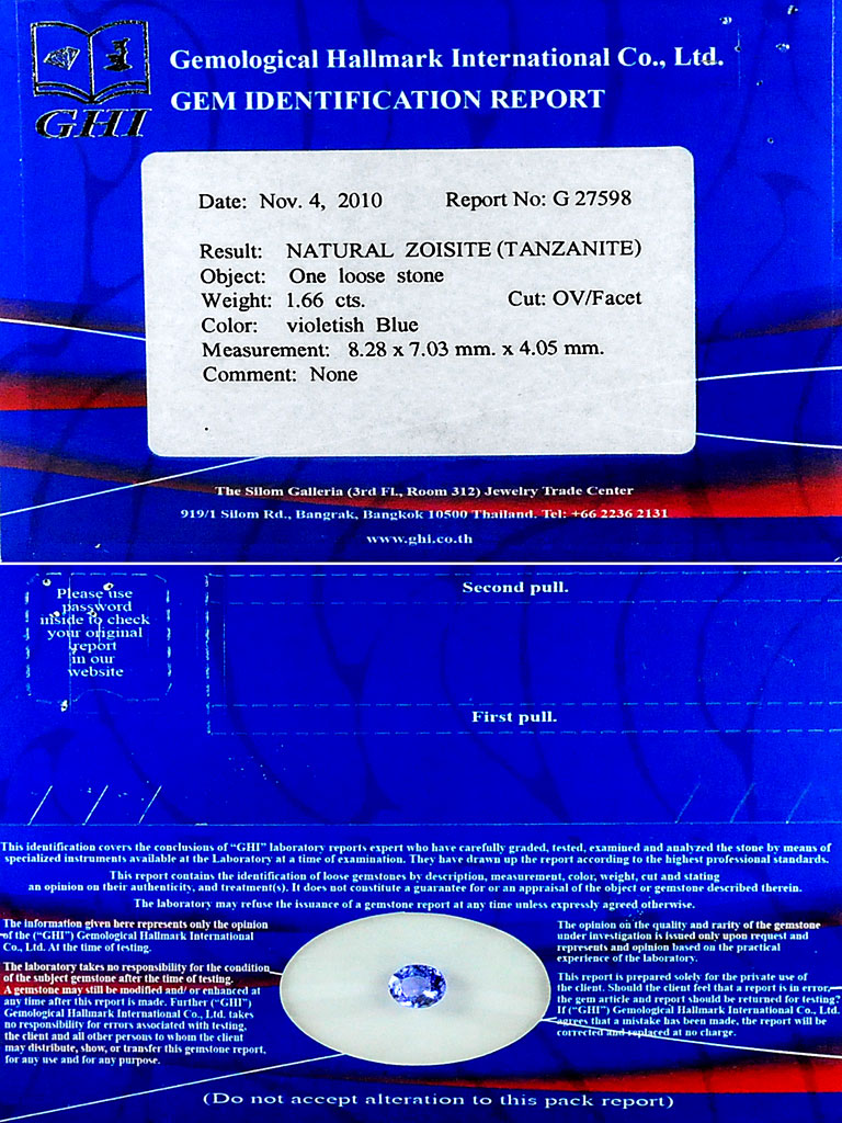 Certified 1.66 Ct. Oval Shape Natural Gem Violetish Blue Tanzanite From Tanzania