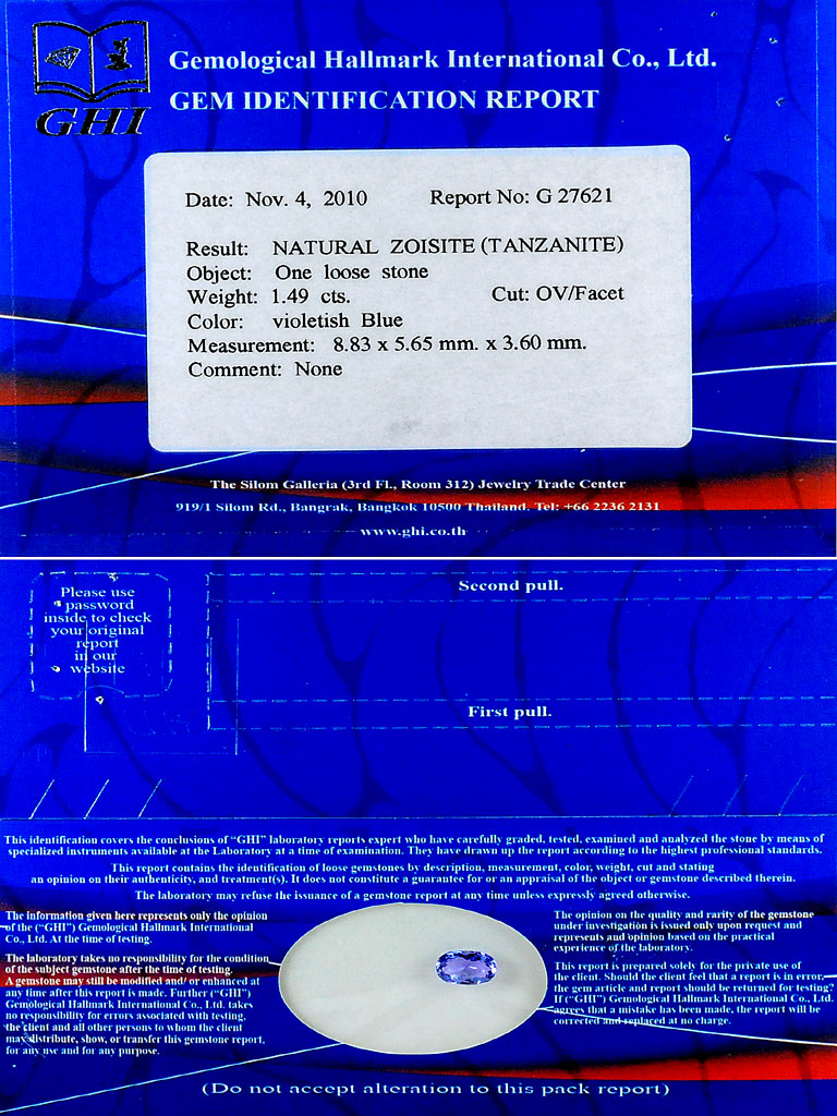 Certified Violetish Blue Tanzanite 1.49 Ct. Oval 8.83 x 5.65 Mm. Natural Gem