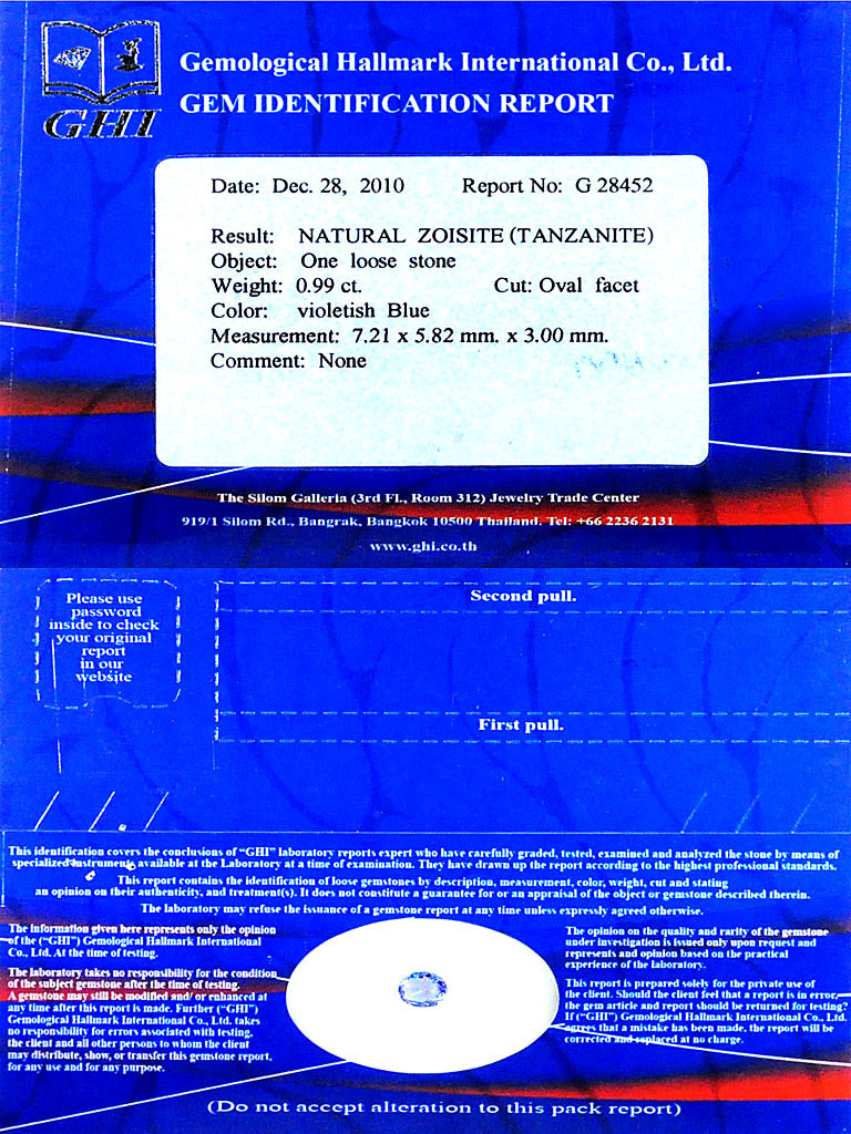 Certified Violetish Blue Tanzanite 0.99 Ct. Clean Oval 7.21 x 5.82 Mm. Natural