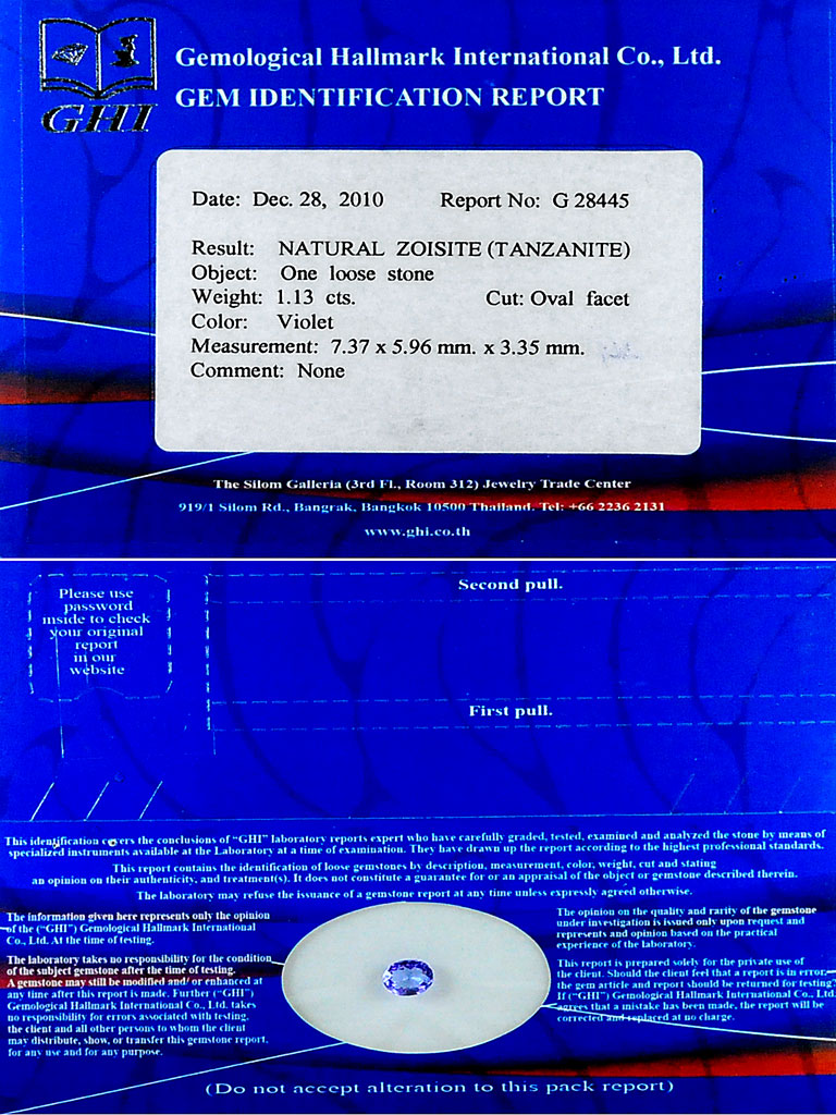 Certified Violet Tanzanite 1.13 Ct. Clean Oval Shape Natural Gemstone Tanzania