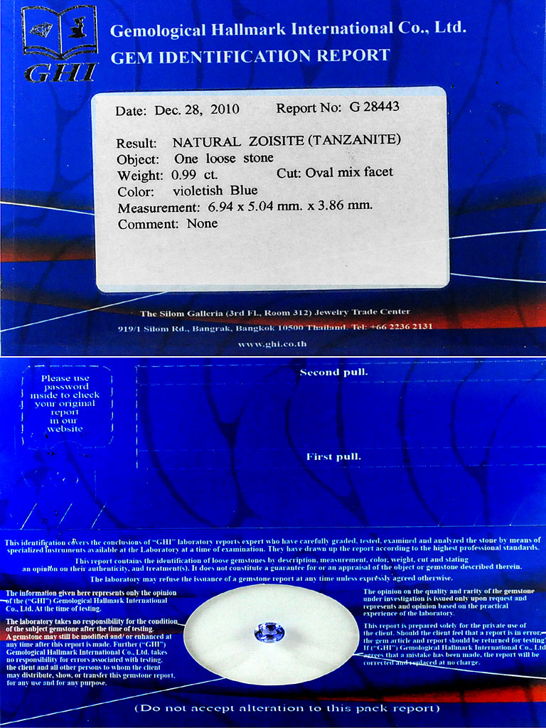 Certified 0.99 Ct. Clean Natural Oval Violetish Blue Tanzanite From Tanzania