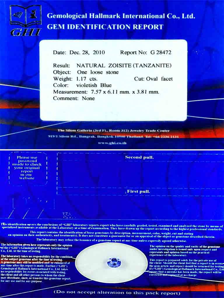 Certified 1.17 Ct Oval Natural Violetish Blue Tanzanite