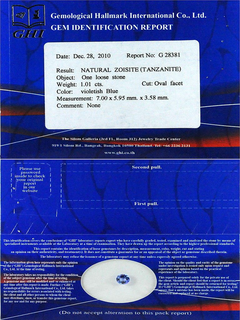 Certified Violetish Blue Tanzanite 1.01 Ct Oval 7.00 x 5.95 Mm. Natural Gemstone