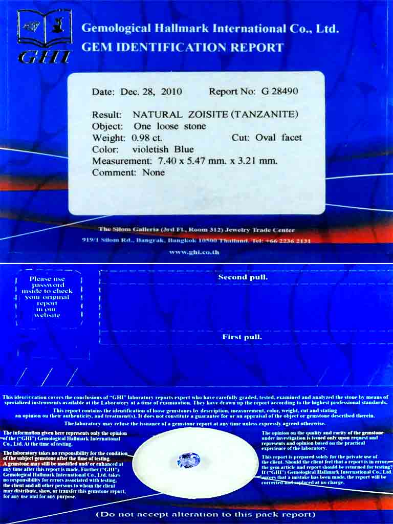 Certified Violetish Blue Tanzanite 0.98 Ct Oval Shape 7.40 x 5.47 Mm Natural Gem