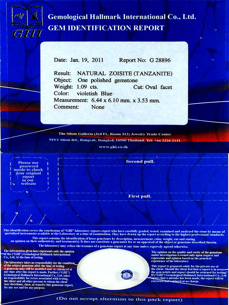 Certified Violetish Blue Tanzanite 1.09 Ct. Clean Oval 6.44 x 6.10 Mm. Natural