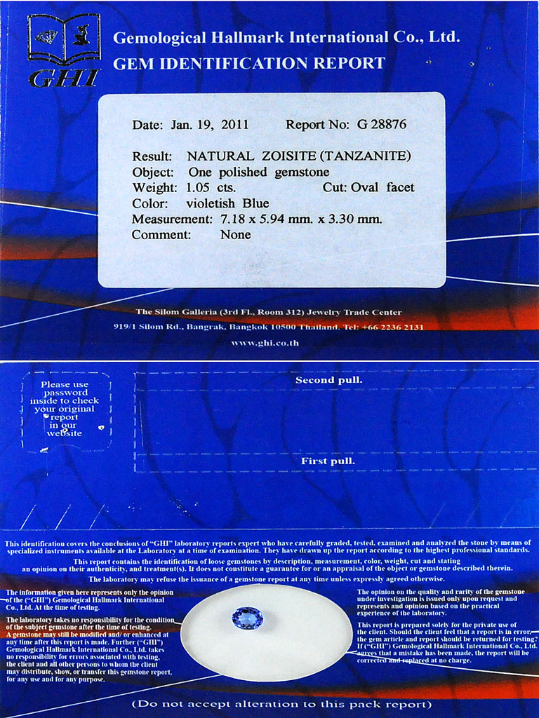 Certified 1.05Ct. Oval Natural Violetish Blue Tanzanite
