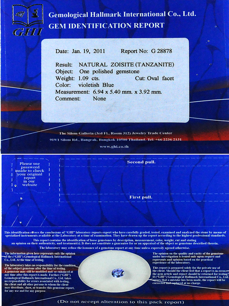 Certified Violetish Blue Tanzanite 1.09 Ct. Oval 6.94 x 5.40 Mm. Natural Gem