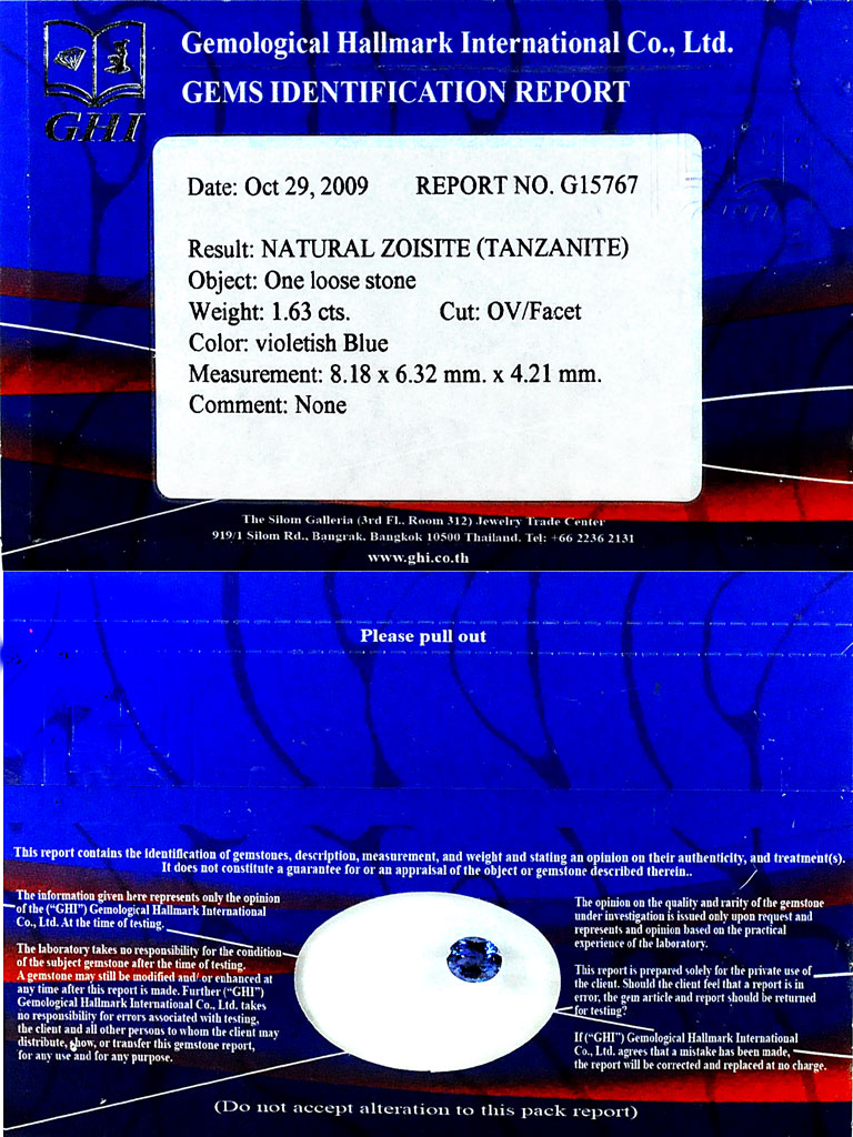 Certified Violetish Blue Tanzanite 1.63 Ct. VVS Oval 8.18 x 6.32 Mm. Natural Gem