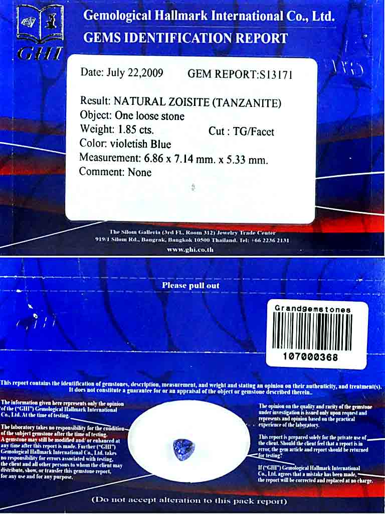 Certified Violetish Blue Tanzanite 1.85 Ct. VVS Trilliant 7.14 x 6.86 Mm Natural