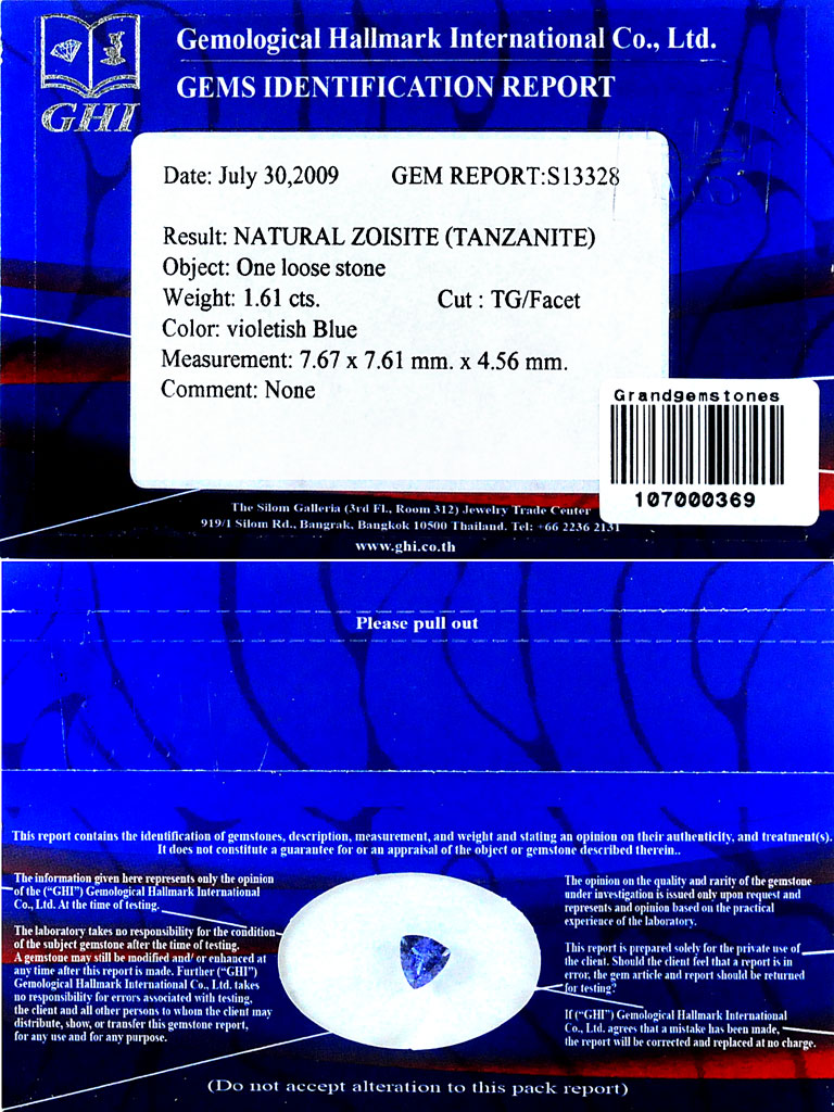 Certified Violetish Blue Tanzanite 1.61 Ct. VVS Trilliant Shape Natural Gem