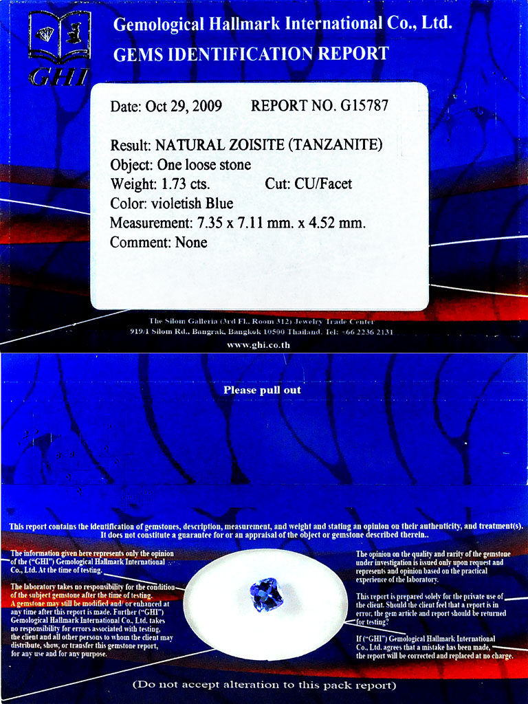 Certified Blue Tanzanite 1.75 Ct. Clean Cushion 7.35 x 7.11 Mm. Natural Gemstone