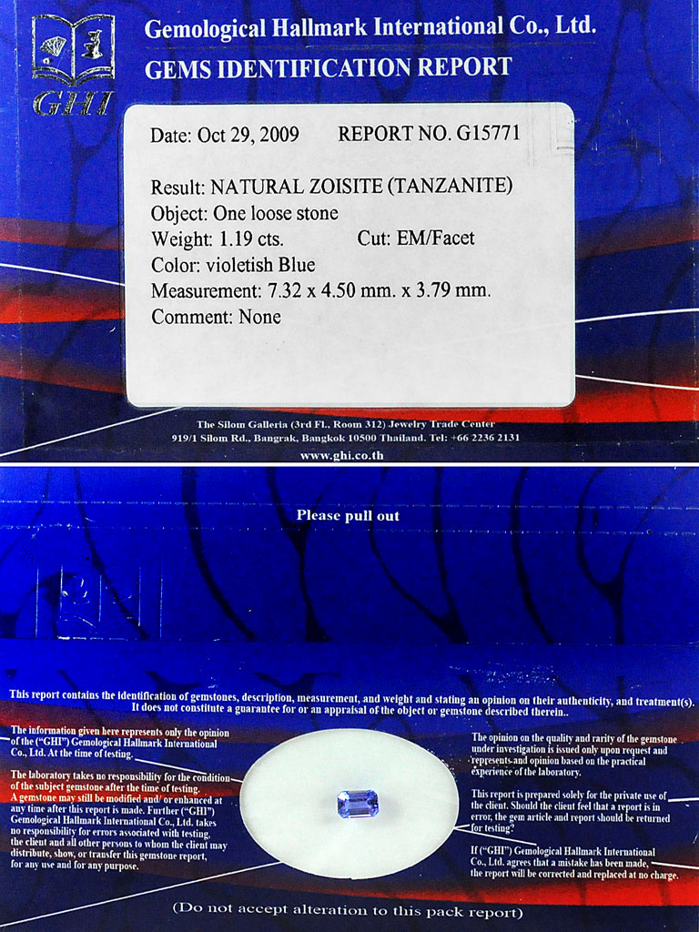 Certified Violetish Blue Tanzanite 1.19 Ct. Clean Octagon 7.32 x 4.50 Mm Natural