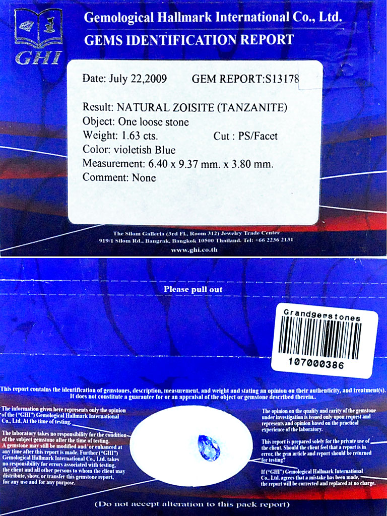 Certified Violetish Blue Tanzanite 1.63 Ct Clean Pear 9.37 x 6.40 Mm Natural Gem