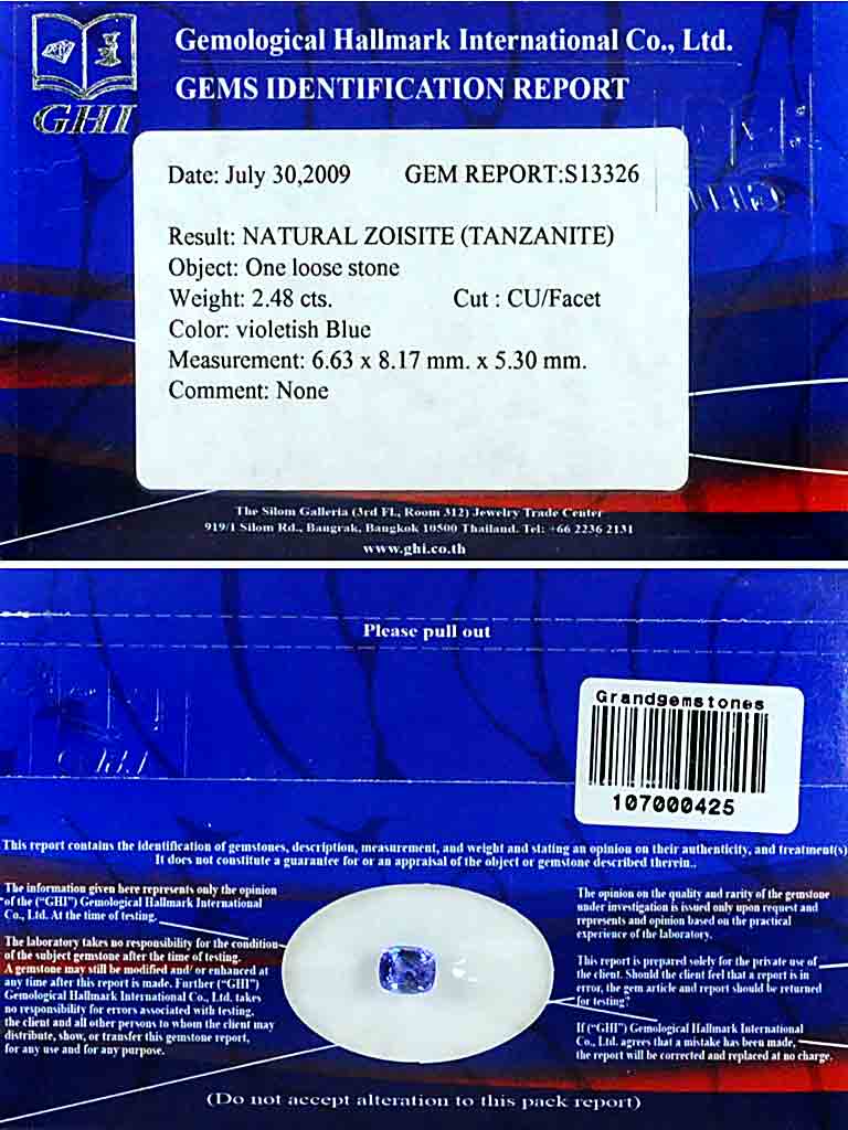 Certified Violetish Blue Tanzanite 2.48 Ct. Clean Cushion 6.63 x 8.17 Mm Natural