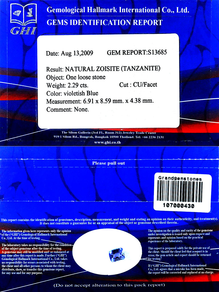 Certified Violetish Blue Tanzanite 2.29 Ct. Clean Cushion 6.91 x 8.59 Mm Natural