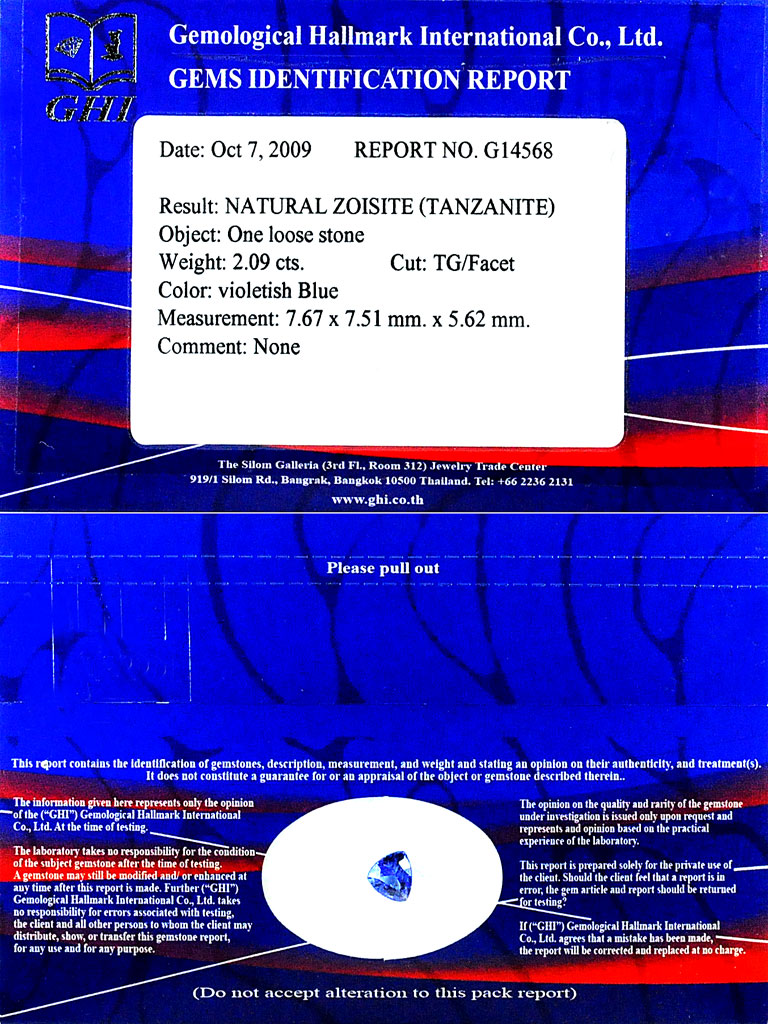 Certified Violetish Blue Tanzanite 2.09 Ct. Clean Trilliant Natural Gem Tanzania