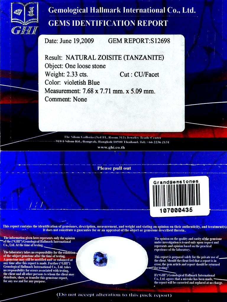 Certified Violetish Blue Tanzanite 2.33 Ct. Clean Cushion Natural Gem Tanzania