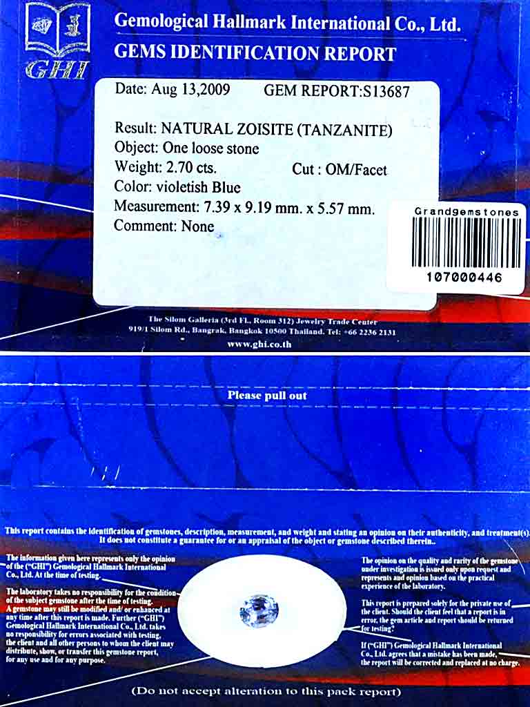 Certified Violetish Blue Tanzanite 2.70 Ct. VVS Oval 9.19 x 7.39 Mm. Natural Gem