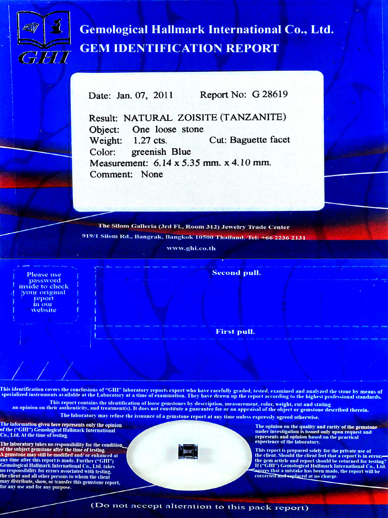 Certified Greenish Blue Tanzanite 1.27 Ct. VVS Baguette 6.14 x 5.35 Mm. Natural