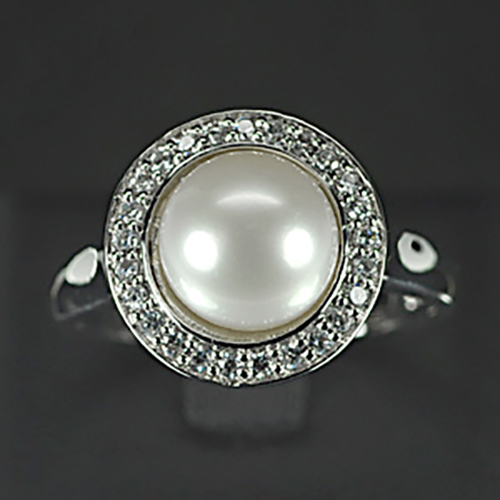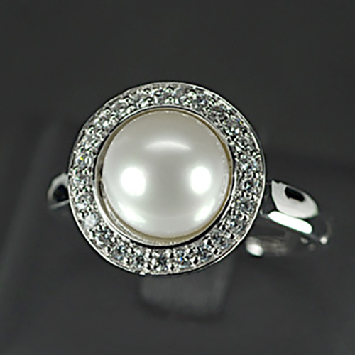 Round Cabochon 9 Mm. Natural White Pearl 925 Sterling Silver 5.20 G. Ring Size 9
