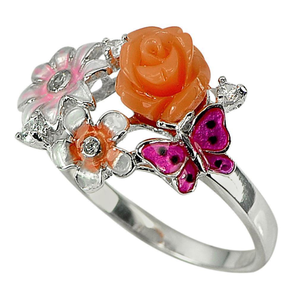 4.45 G. Flower Resin Butterfly Enamel Real 925 Sterling Silver Ring Size 6