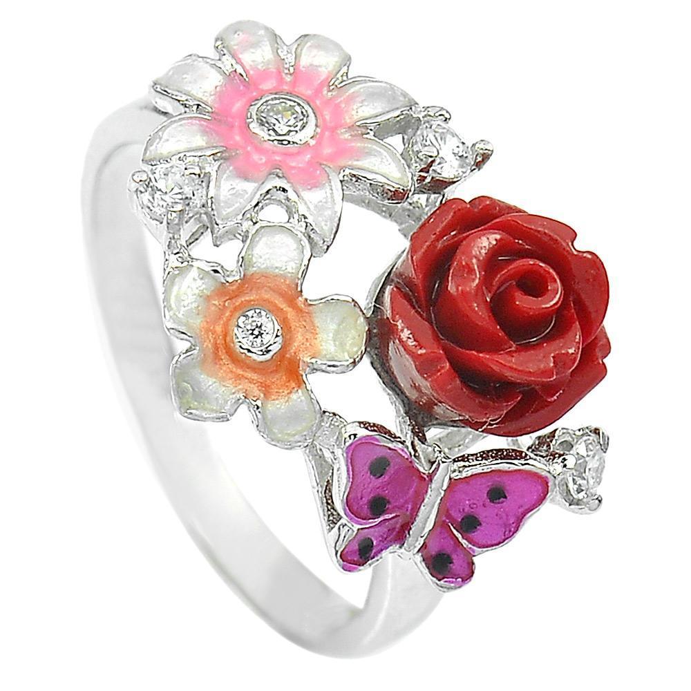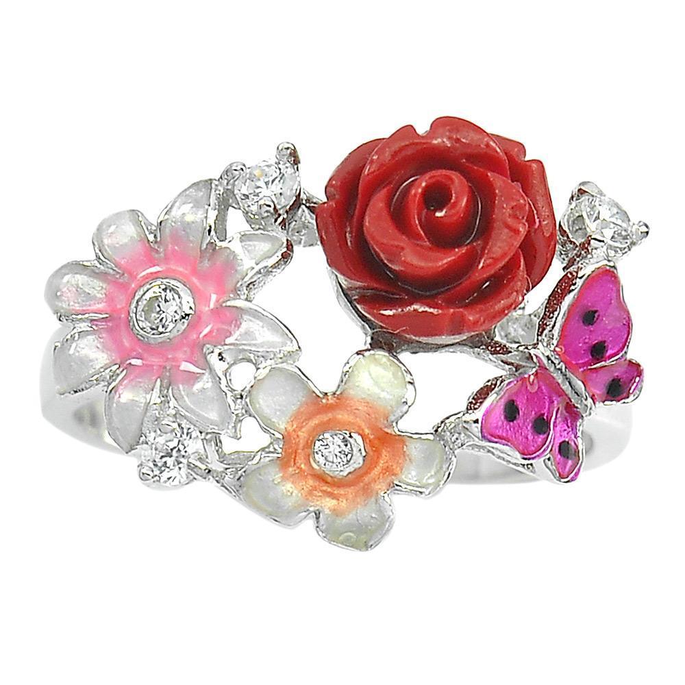 4.61 G. Rose Resin with Butterfly Enamel Real 925 Sterling Silver Ring Size 8