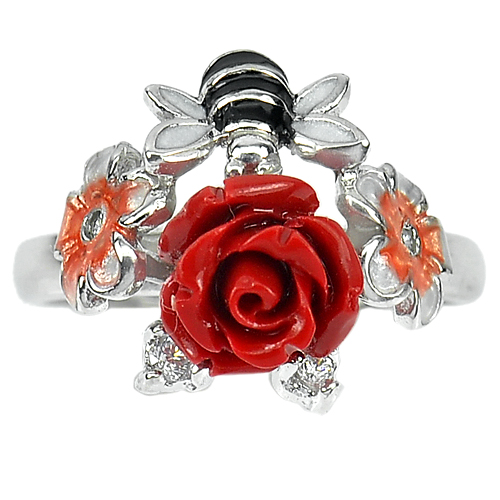 4.45 G. Good Rose Red Resin with Bee Enamel Real 925 Sterling Silver Ring Size 6