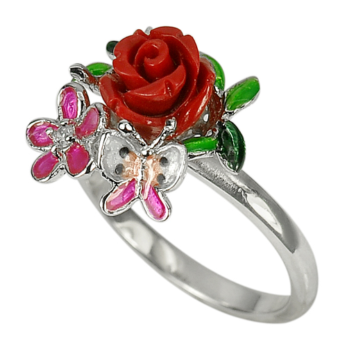 4.16 G. Flower Resin with Butterfly Enamel Real 925 Sterling Silver Ring Sz 7