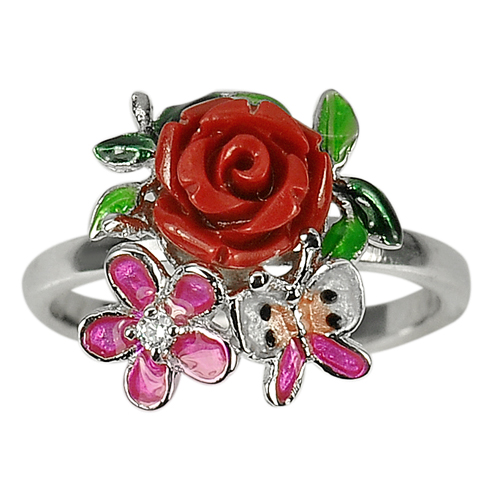 4.40 G. Flower Resin with Butterfly Enamel Real 925 Sterling Silver Ring Sz 8