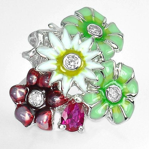 9.57 G. Nice Flower Enamel Design Real 925 Sterling Silver Ring Sz 6