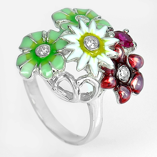 8.19 G. Nice Flower Enamel Design Real 925 Sterling Silver Ring Sz 6