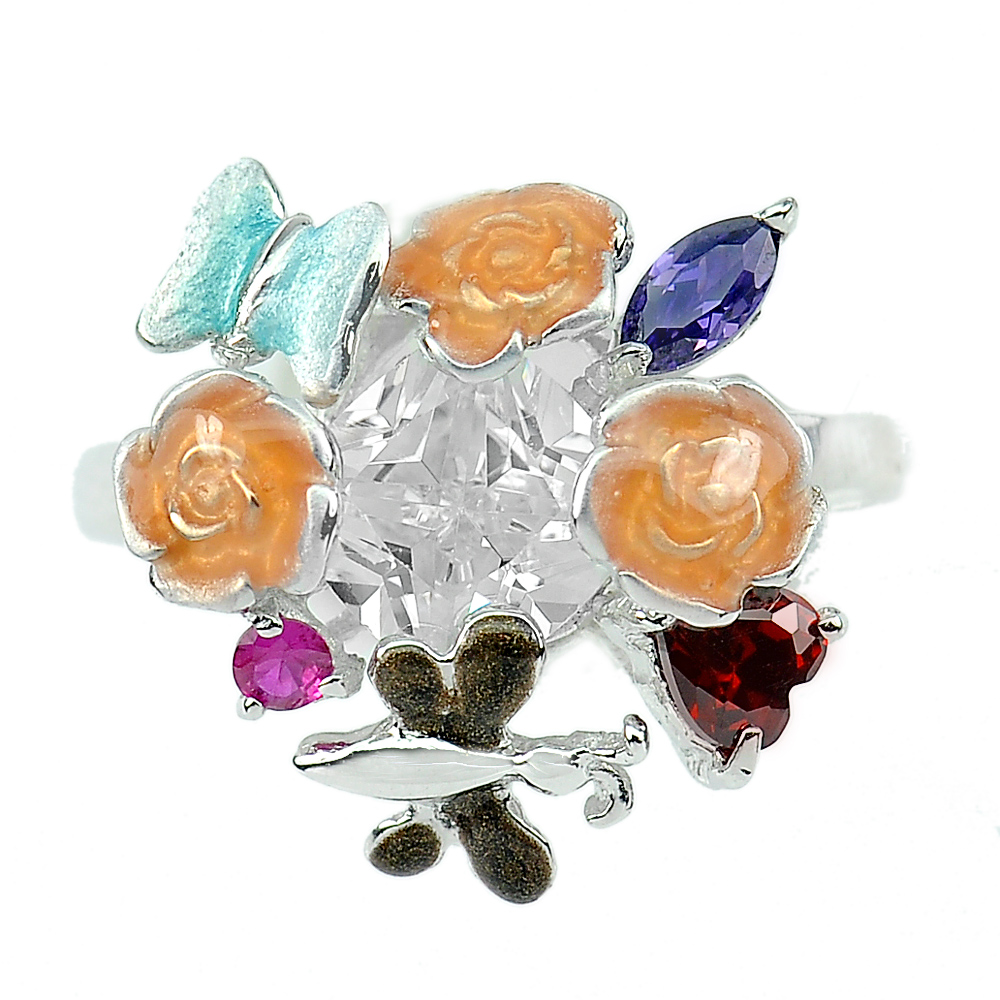 4.60 G. Nice Flower Enamel Design with CZ Real 925 Sterling Silver Ring Size 8