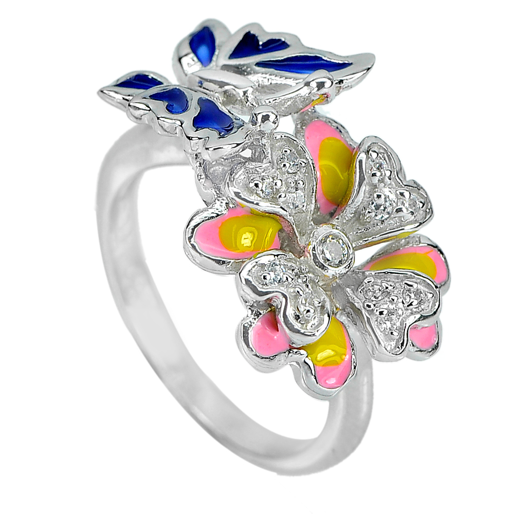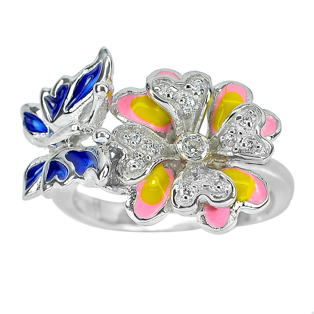 5.99 G. Nice Flower with Butterfly Enamel Real 925 Sterling Silver Ring Size 8
