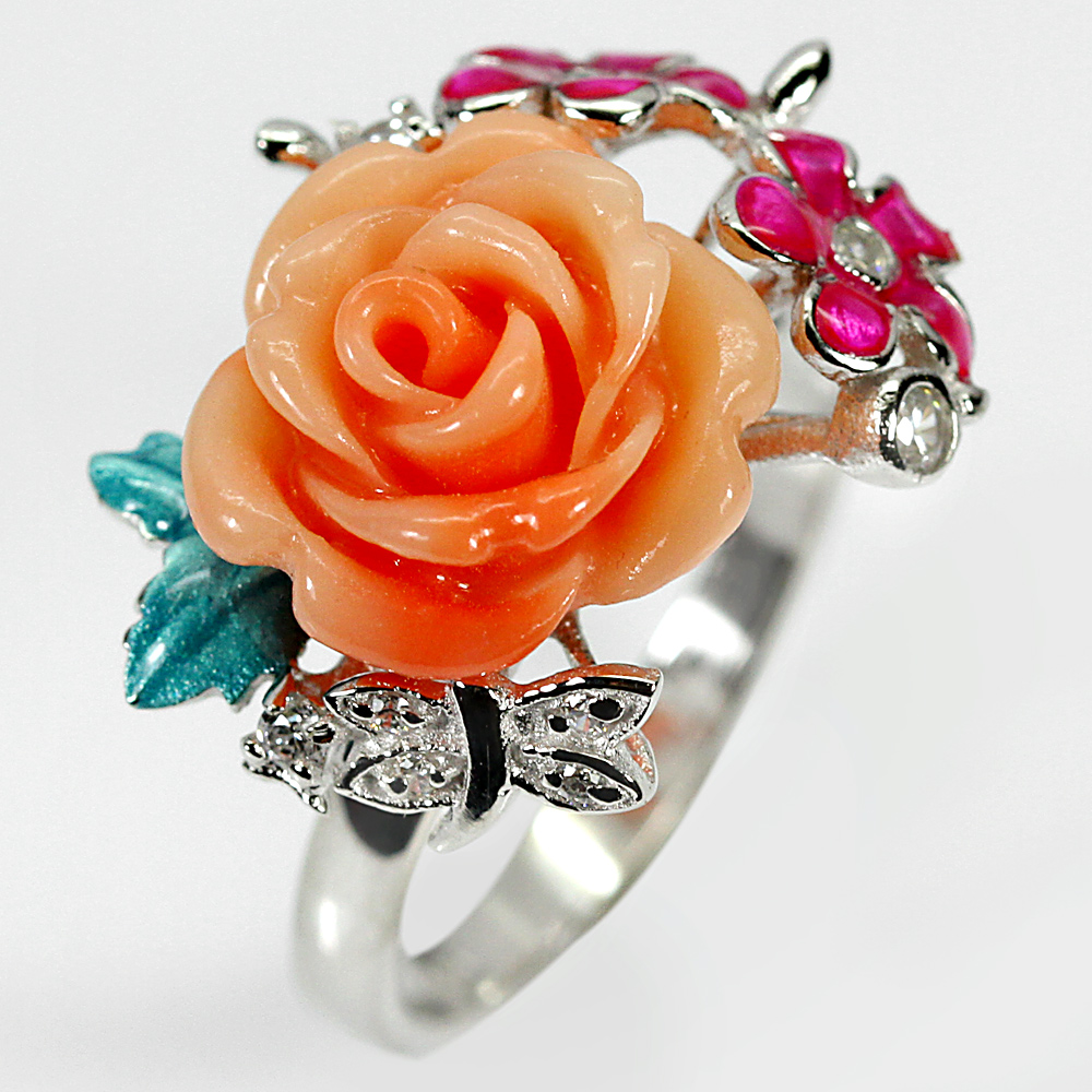 6 G. Good Design Orange Flower Resin Real 925 Sterling Silver Size 9