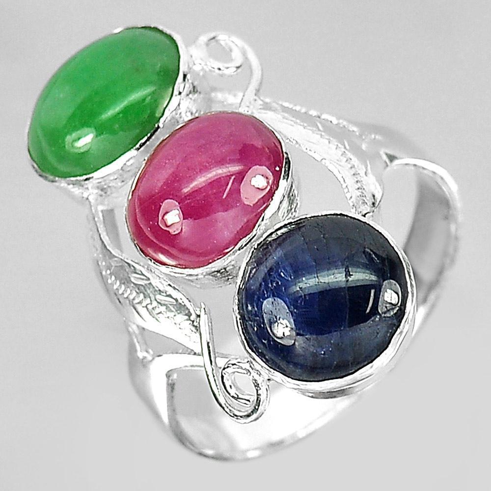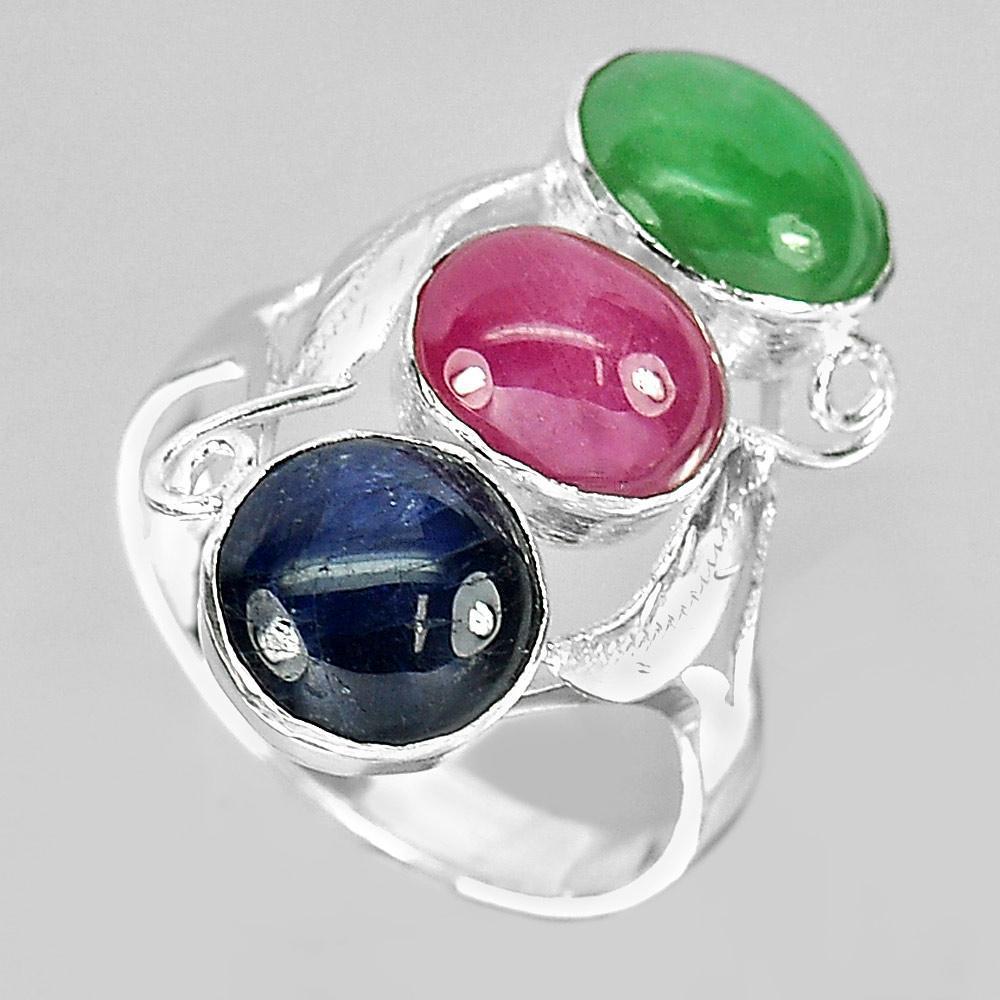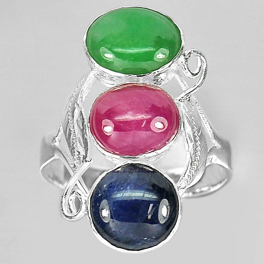 4.02 G. Natural Green Jade Red Ruby Blue Sapphire Sterling Silver Ring Size 7.5