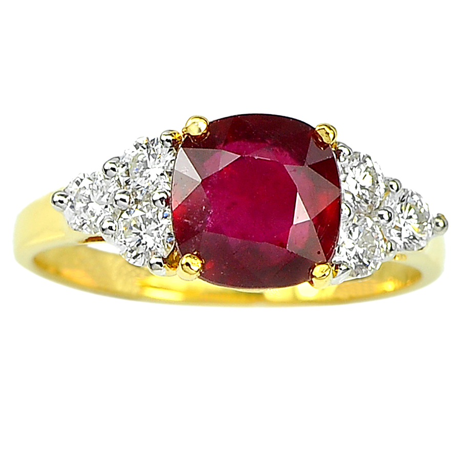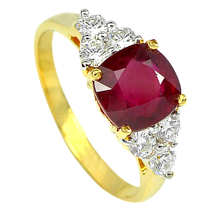 2.49 Ct. Cushion Natural Red Ruby and White Diamond 18K Solid Gold Ring Size 6