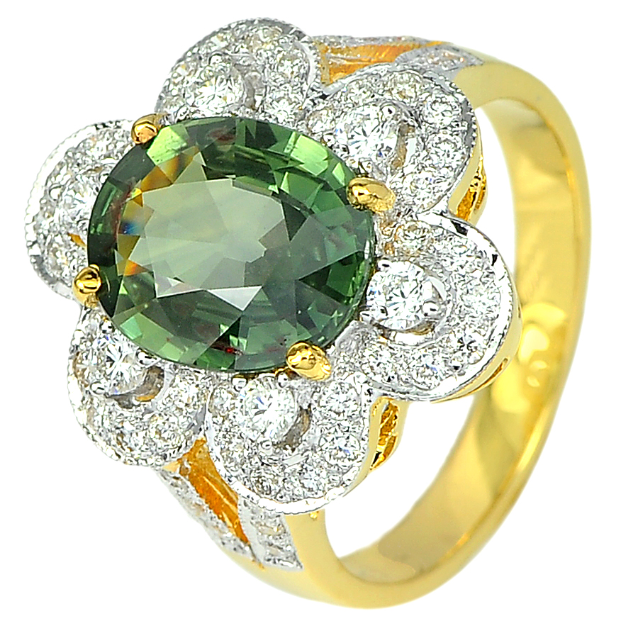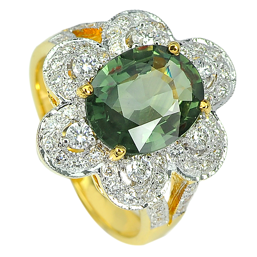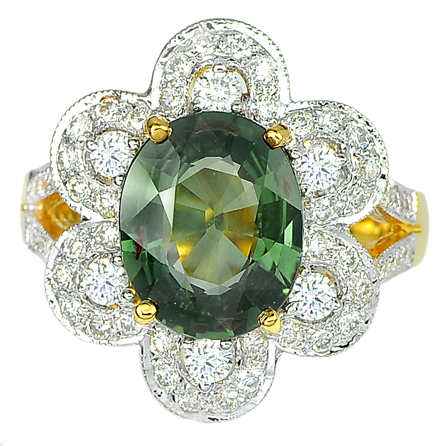 3.40 Ct.Oval Natural Green Sapphire and White Diamond 18K Solid Gold Ring Size 7