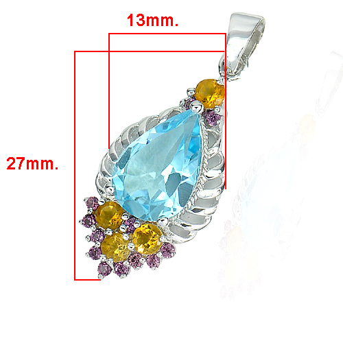 Natural Blue Topaz Pear Size 12.2 x 8.6 Mm. 1 Pc. Yellow Citrine Round Size 3 x 3 Mm. 4 Pcs. And Purplish Pink Rhodolite Garnet Round Size 1 x 1 Mm. 12 Pcs.