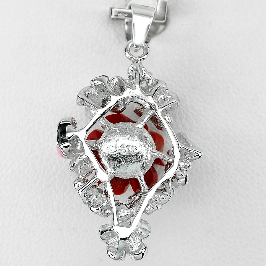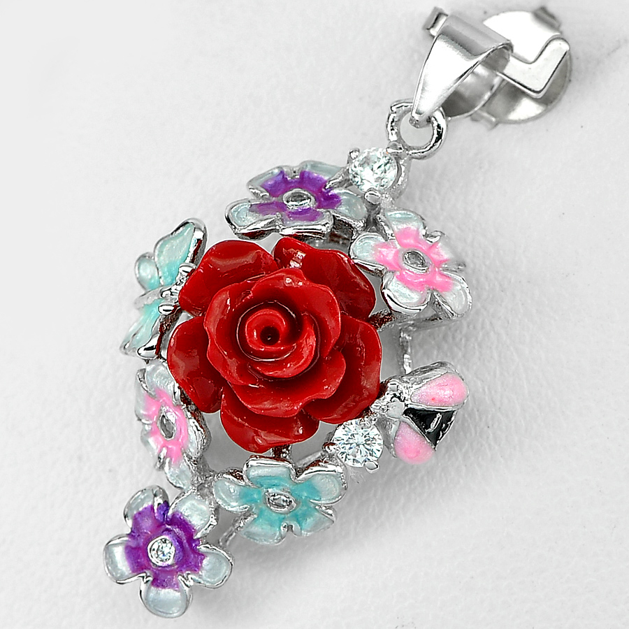 3.25 G. Alluring Red Flower Resin with Round CZ Real 925 Sterling Silver Pendant