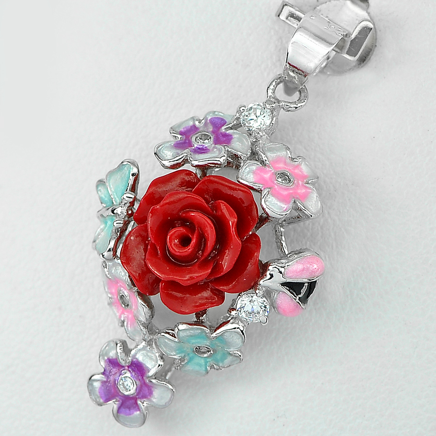 3.45 G. Delightful Red Flower Resin and Enamel Real 925 Sterling Silver Pendant