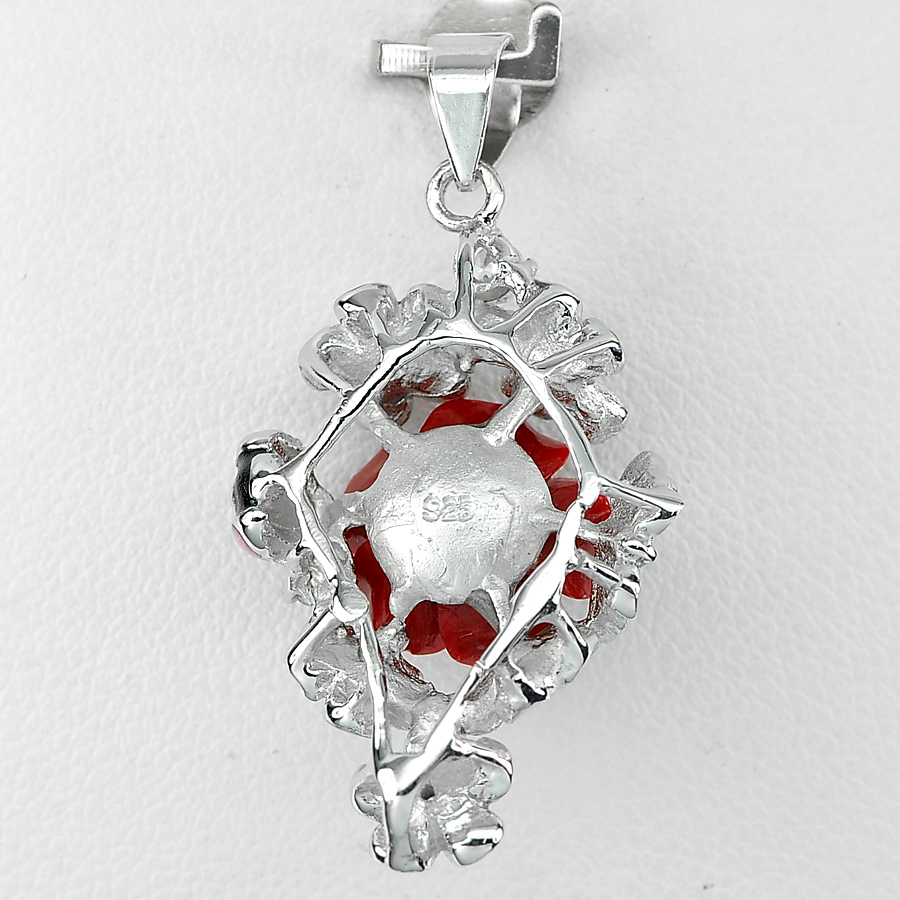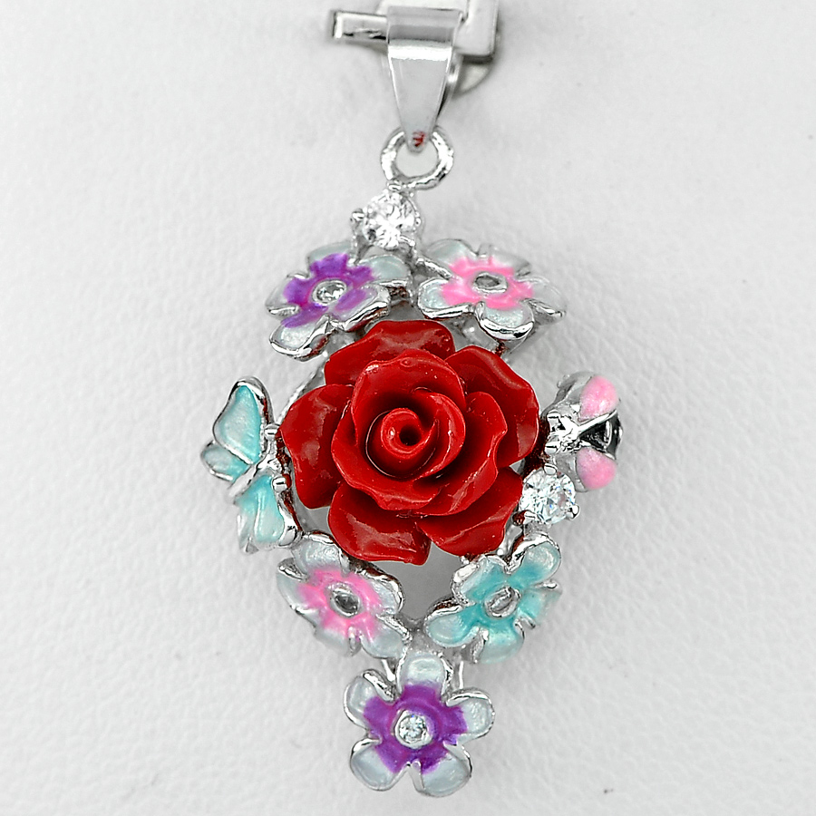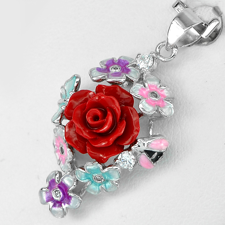3.32G. Real 925 Sterling Silver Pendant Charming Red Flower Resin and Enamel
