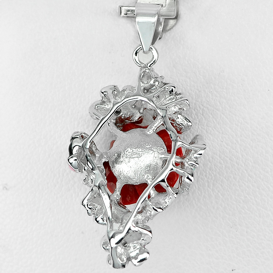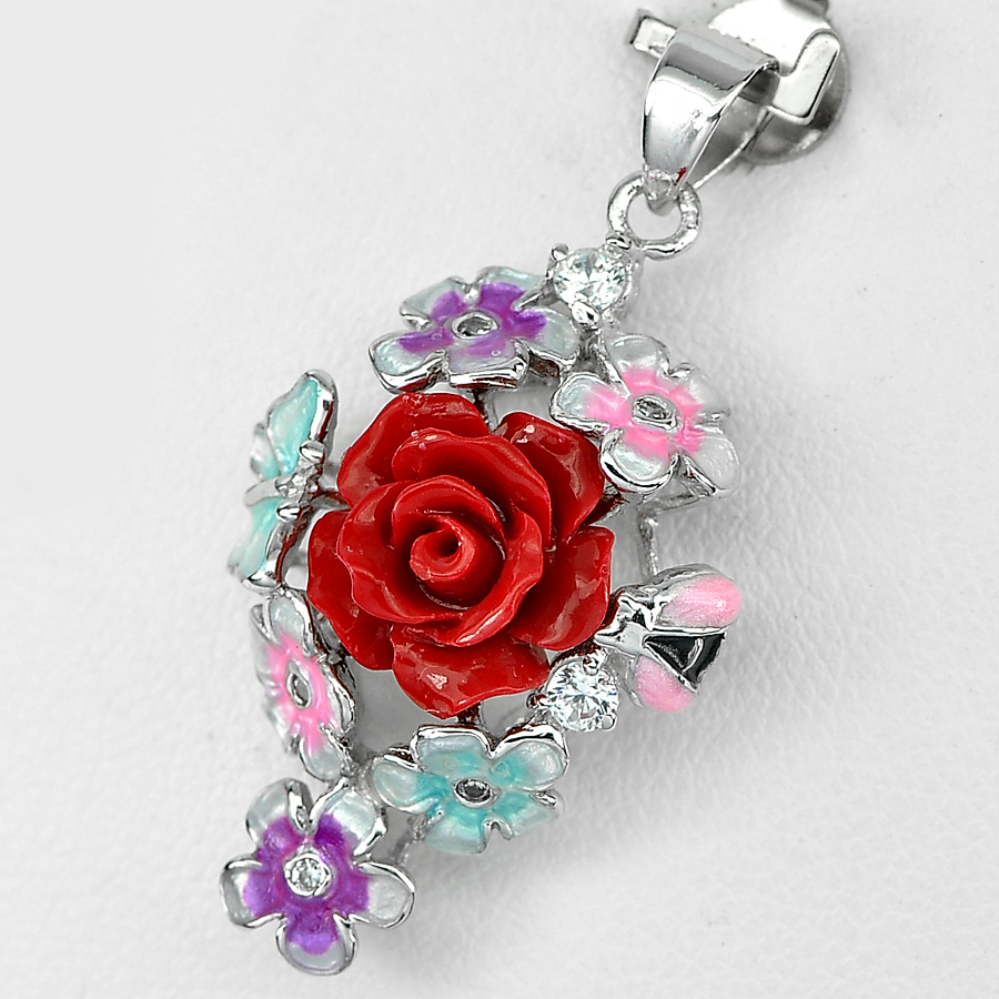 3.34 G. Real 925 Sterling Silver Pendant Ravishing Red Flower Resin and Enamel